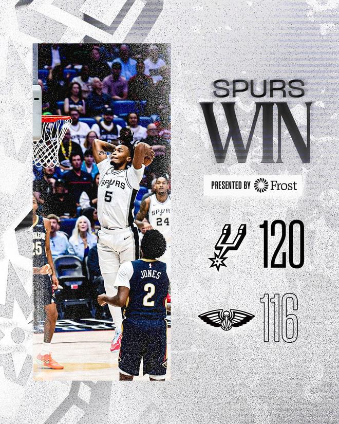 加时赛里,文班亚马暴扣,随后大帽墨菲,奎因强攻篮下被犯规,文班亚马6次犯满离场,奎因罚中1球。瓦塞尔轰进三分球,鹈鹕挑战判罚失败,卡斯尔2罚1中,锡安强攻篮下得手,尚帕尼回敬远投。普尔连续外线不中,卡斯尔罚中2球,马刺打出了11比3的攻势得以锁定大局。锡安篮下得分,卡斯尔2罚不中,普尔上篮打进,马刺请求暂停。卡斯尔失误,鹈鹕请求暂停。费尔斯篮下得分,巴恩斯罚进2球,普尔超远三分球不中,比赛时间走完。最终,马刺以120比116险胜鹈鹕,得以斩获2连胜。